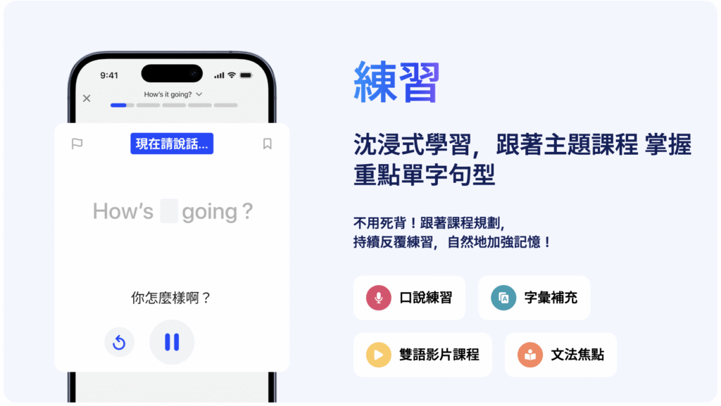 它不只是單純的單字或文法練習,而是透過 即時 AI 回饋、情境模擬、專屬學習數據,讓你像擁有一位 24 小時隨身英文家教。